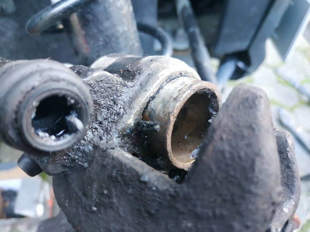 Das Gummi ist an zwei Stellen als Fitzel herausgedrückt. So kann ich ja unmöglich fahren, nachher drückt es die Bremsflüssigkeit da raus.