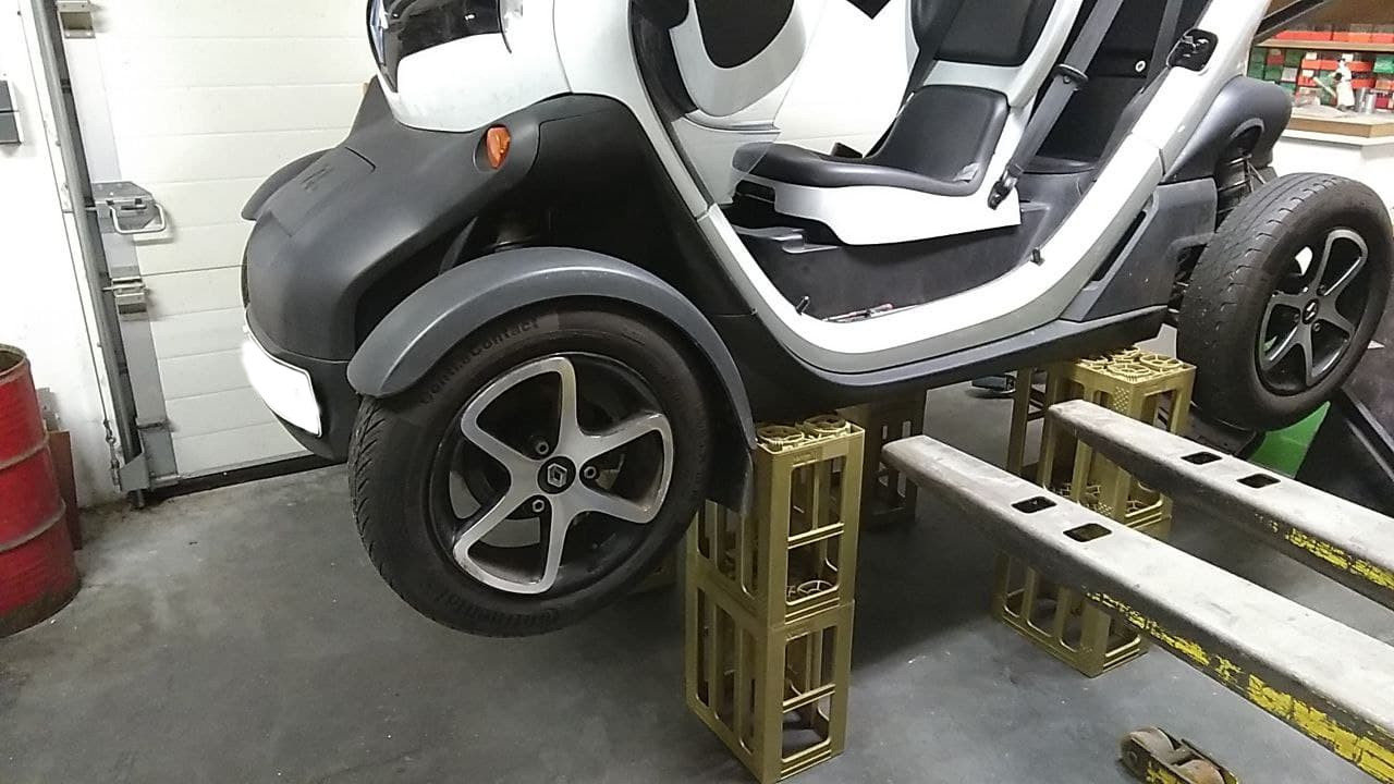 jedenfalls fühle mich sicher unter dem aufgebockten Twizy.