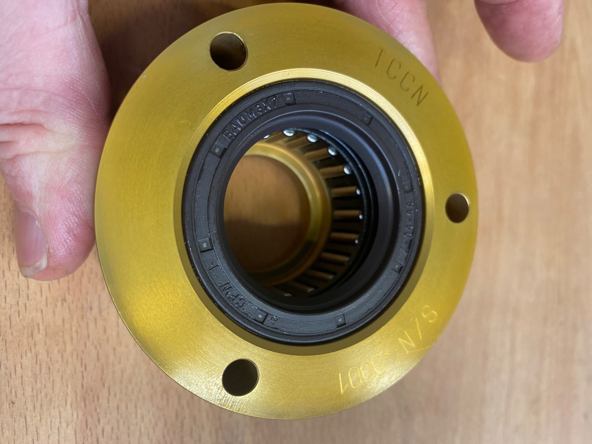 Im inneren wirkt jetzt ein Nadellager mit 22mm Breite, dadurch ist die Auflagefläche für die Motorhülse länger, sie kann nicht mehr verkanten. Das Nadellager ist ohne Innenring ausgeführt, dadurch erhalten wir ein paar Hundertstel mehr Spiel, falls wir Axial nicht 100% mittig sitzen, des Weiteren kann sich der Rotor besser bei wärme ausdehnen ohne das was klemmt.
