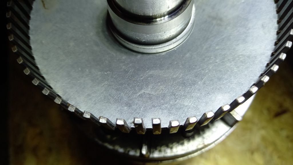 Beim Drehzahlgeber sind 2 der Fähnchen verbogen, Tom hat sie nach Augenmaß gerichtet, danach habe ich den Rotor auf die Drehmaschine genommen und die Fähnchen mit der Feinzeiger Meßuhr kontrolliert. Volltreffer Tom hat mit bloßem Auge die zwei Fähnchen auf 1/10mm genau hin bekommen.