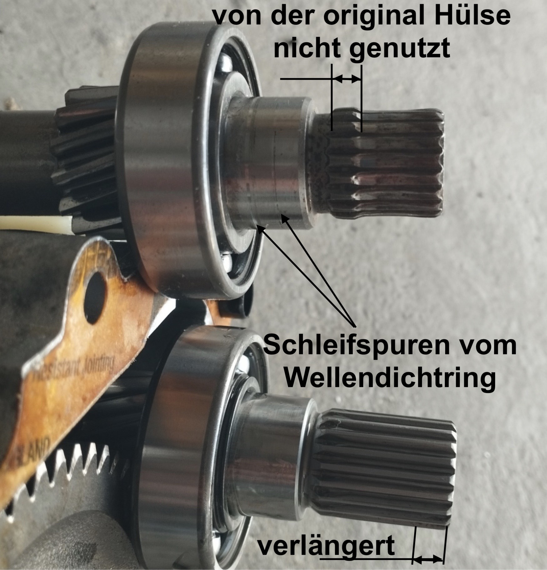 Auf dem Foto sieht man auch sehr schön das die (untere) neue Welle im Bereich der Verzahnung im Durchmesser größer ist.