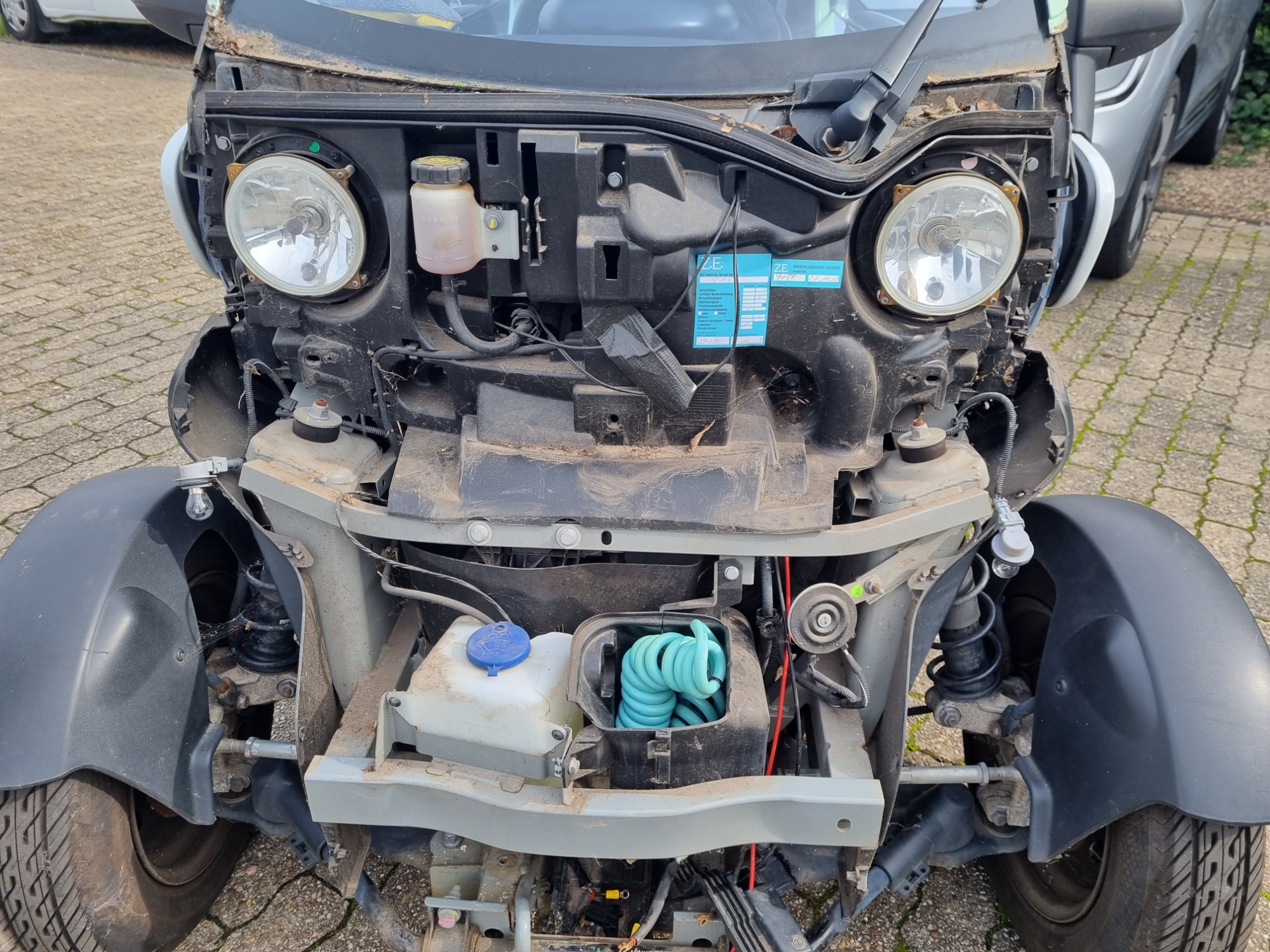Samstag hatte ich den ADAC deswegen bei mir, der suchte die Anleitung raus, weil er noch an keinem Twizy gearbeitet hat und baute unten die kleine Frontschürze mit dem Nummernschild ab.