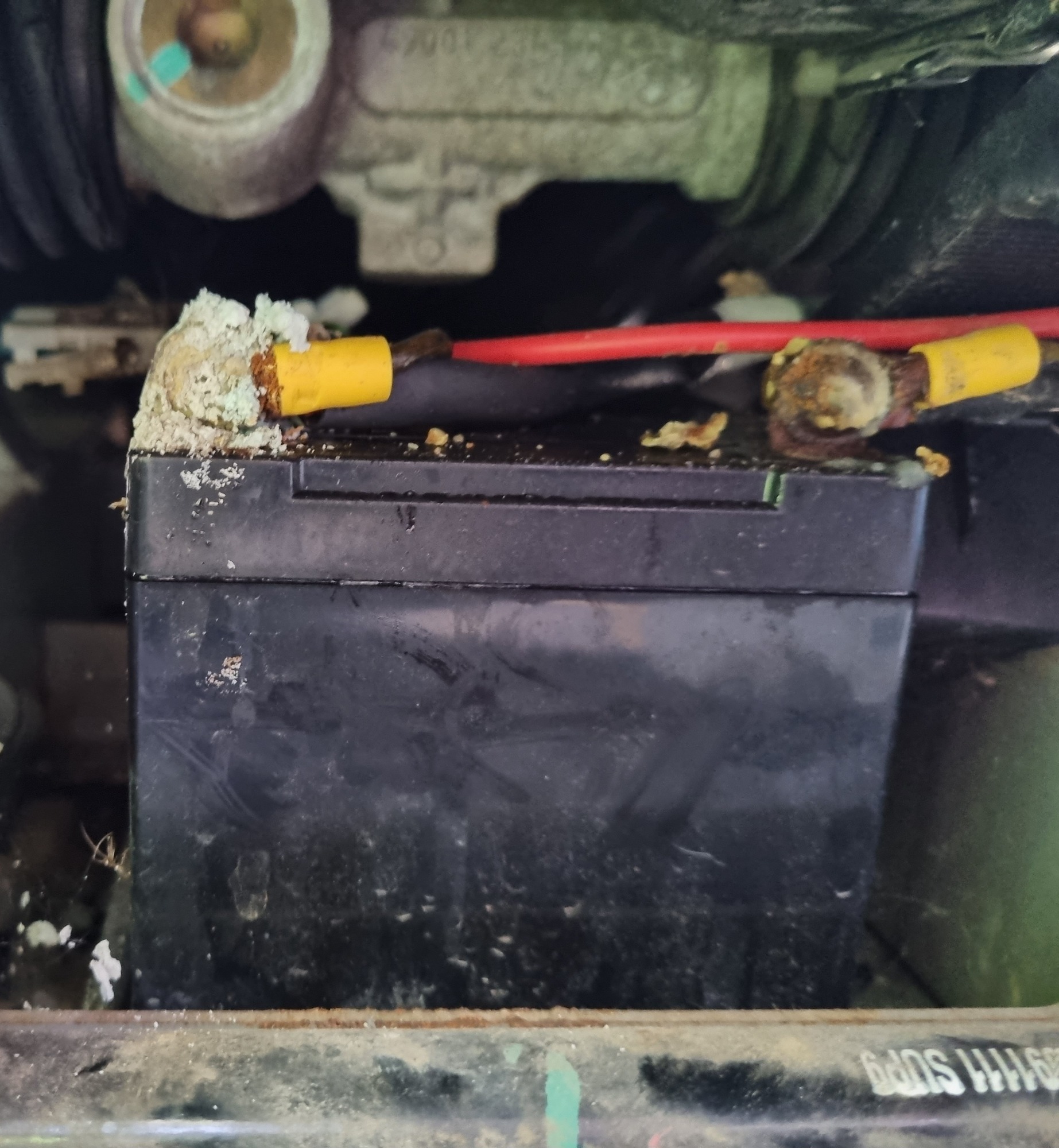 Die Batterie ist an den Polen ziemlich korodiert (nennt man das so?) , die Schrauben waren ziemlich verrostet, aber er hat sie los bekommen.