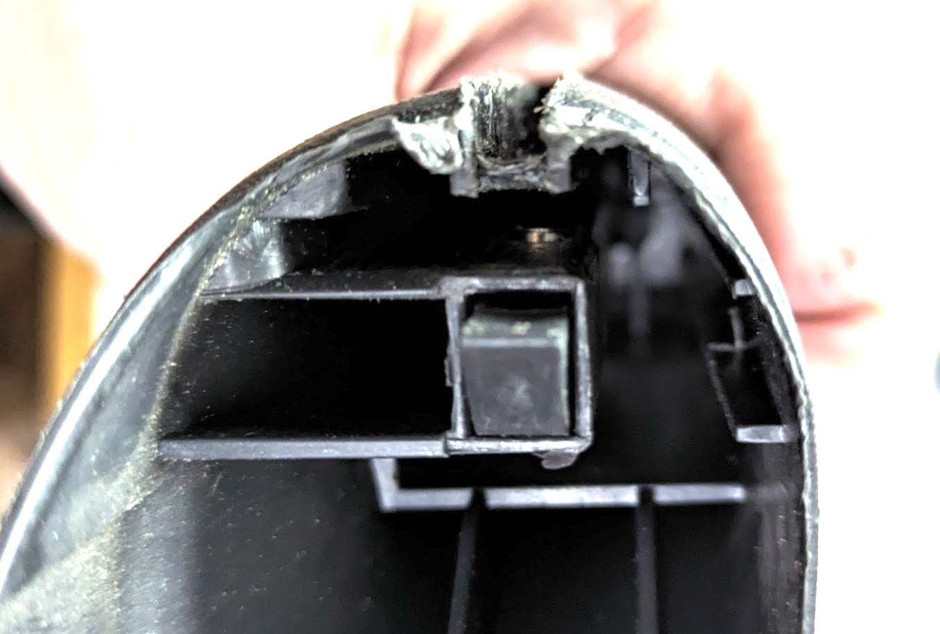 da ist ein Plastikteil drin, das dann die Griffhalteschraube (likes Loch) verdeckt.