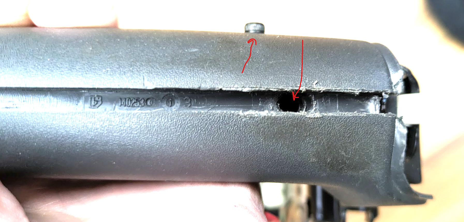 Der linke Pfeil zeigt die 2, Schraube die den Griff am Metallhebel fixiert