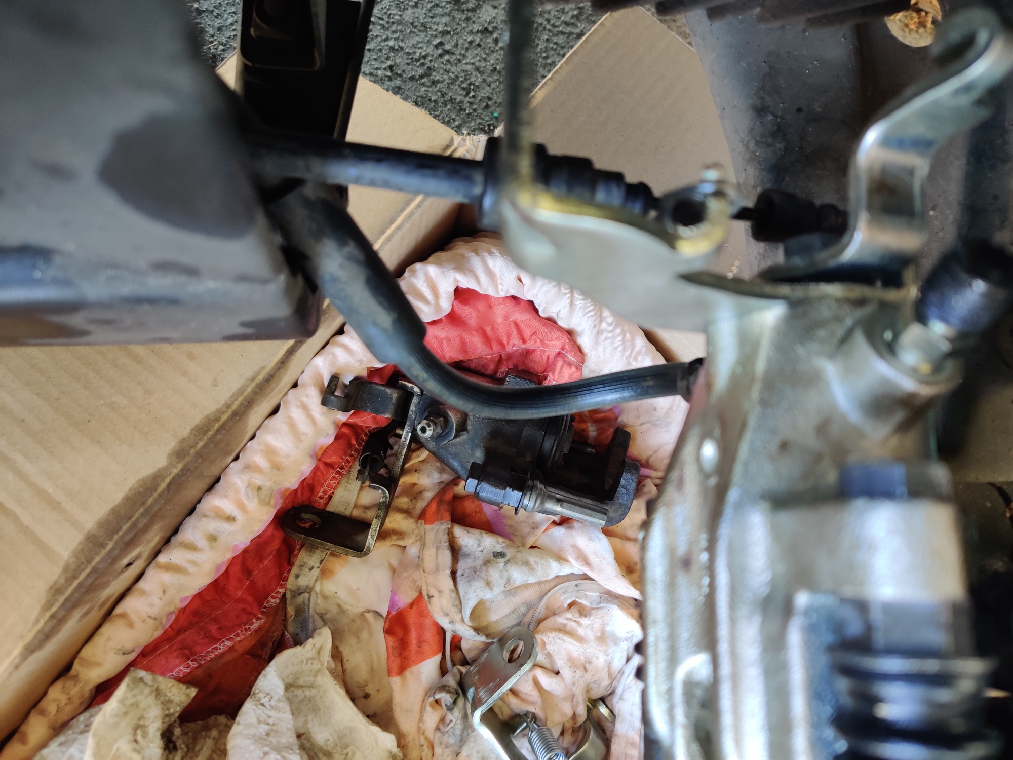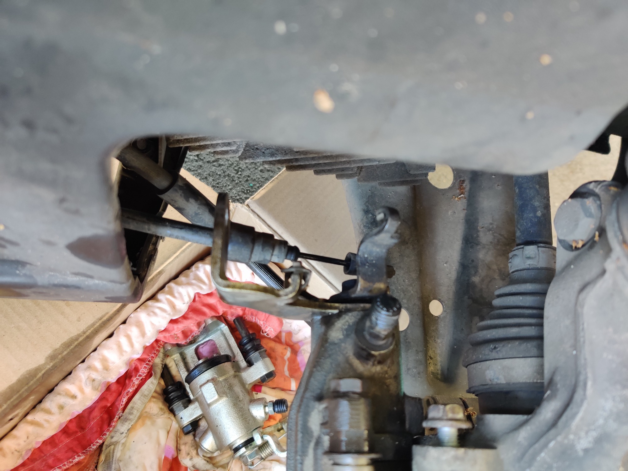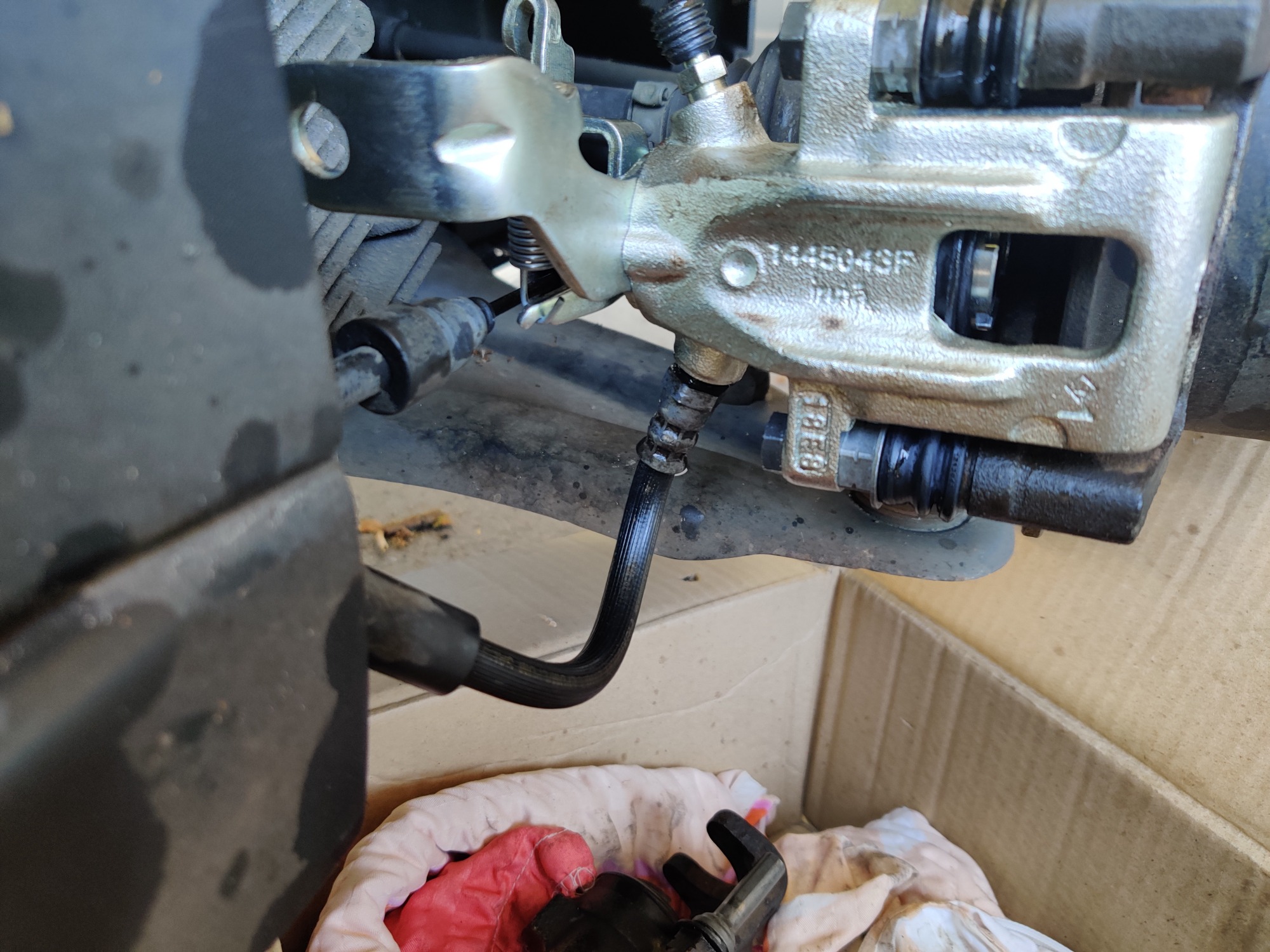 An die Verschraubung des Bremsschlauchs zur festen Leitung hin dran zu kommen ist ein echtes "Pain in the Ass"... die sitz unter dem Seitenschweller. Kaum Platz um von unten dranzukommen, ich hatte bei meinem Roten am Ende den Schweller teilweise abgebaut ( was ja einiges an Vorarbeiten bedeutet...) und an Darth Vader einen billigen Bremsleitungsschlüssel um 45° abgebogen um die verfi... Überwurfmutter zu lösen.