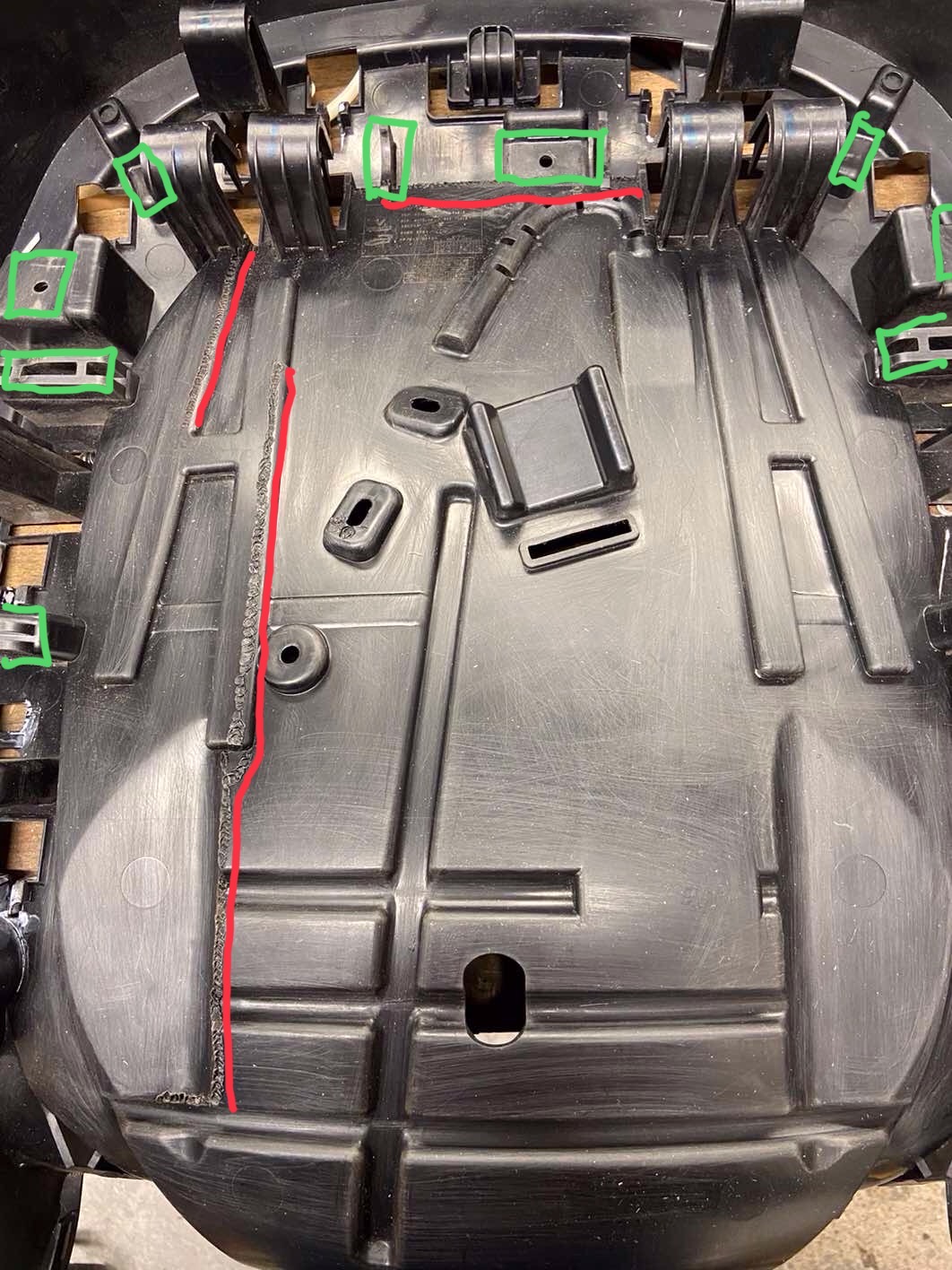 Wenn meine Sitzschale ausgebaut ist sieht das von unten so aus. In Rot habe ich die Risse eingezeichnet die das Teil bekommen hat.