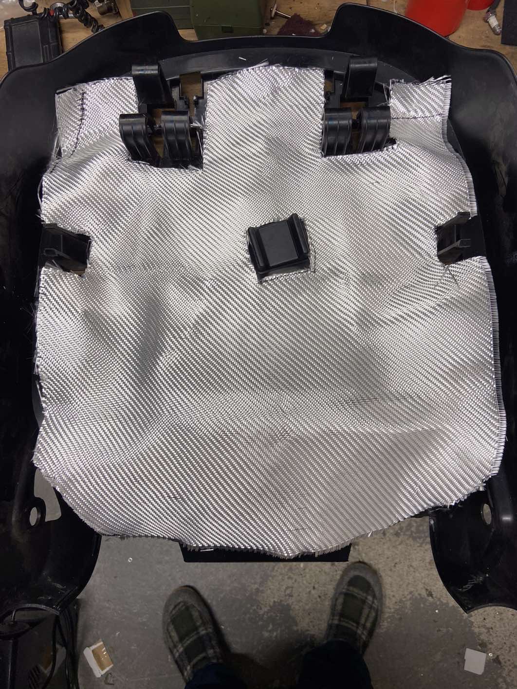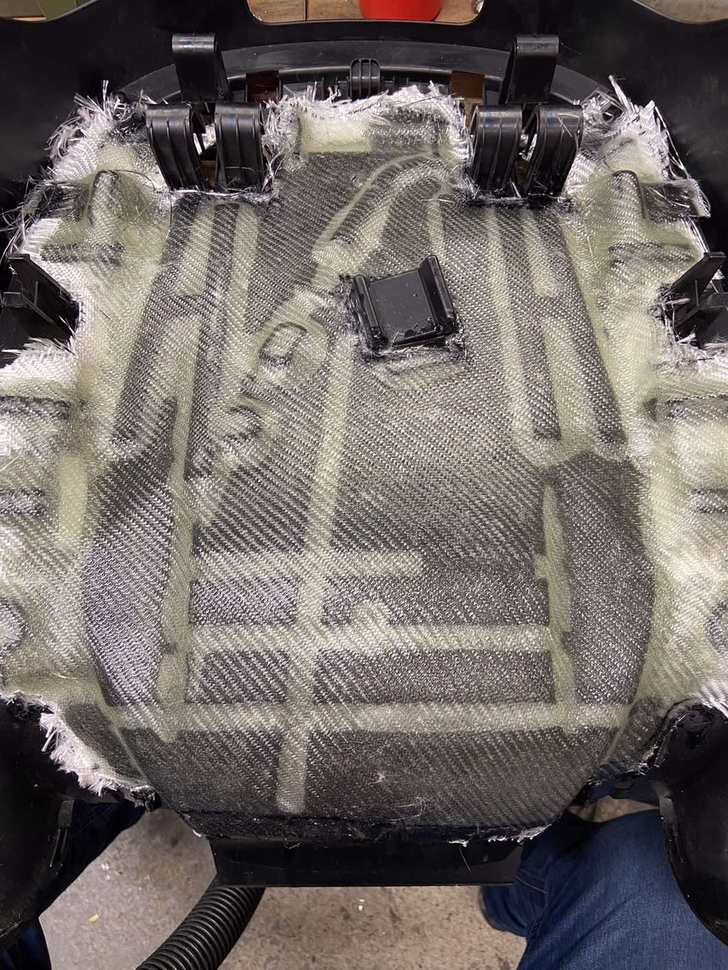 Von diesen Matten habe ich 4 Stück vorbereitet. Dann wird die Sitzschale leicht angeschliffen. Ich nehme 24H Harz das härtet langsam und benetzt gut , zudem man hat Zeit für die Bearbeitung. Erst die Schale mit Harz einpinseln dann die erste Lage auflegen und mit Pinsel die Matte tränken. usw. Bis die 4 Matten gut getränkt mit wenig Luft dazwischen aufliegen. Danach sieht es so aus.
