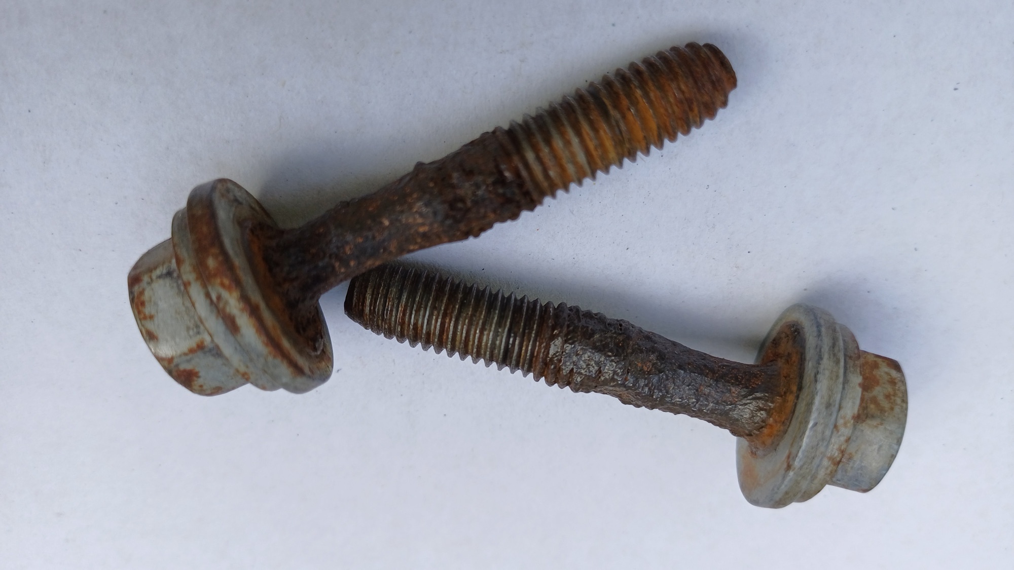 Ich hatte diese Schrauben vor zwei Jahren vorsorglich alle nacheinander rausgenommen abgebürstet und mit reichlich Kupferpaste wieder eingesetzt. Die Meisten hatten Rostbefall waren aber nicht so abgemagert wie die Exemplare auf dem Foto. Wenn die Mutter auch so weggegammelt ist wird nichts mehr halten. Das die Schraube abreisst ist auch möglich. Die Idee diese Stelle mit Fett zu fluten ist daher gut. Die Schraube ist ja in Kopfnähe besonders dünn. Das ist dann der Teil in dem Querträger sitzt. Das Wasser kann nicht rausfließen weil der Schraubenkopf den Abfluss verschließt. Die originalen Schrauben durch V2A Schrauben zu ersetzen ist auch noch möglich und wohl die beste Lösung.