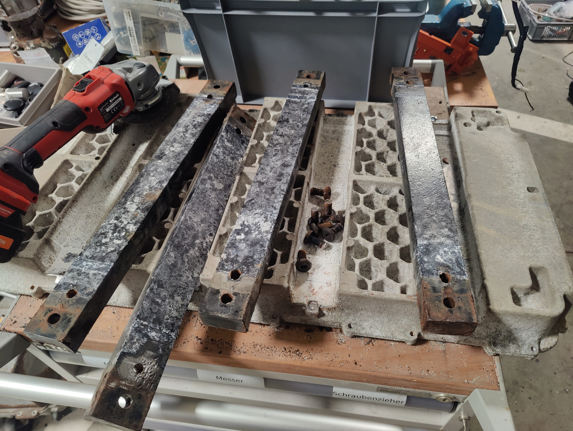 hat jemand schonmal die Stahlbalken unterm Akku vom akkuboden entfernt? Ich habe einen extrem korrodierten Akku ausgeschlachtet, und würde noch gern die Schienen unter einen anderen Akku schrauben, wo sie fehlen.