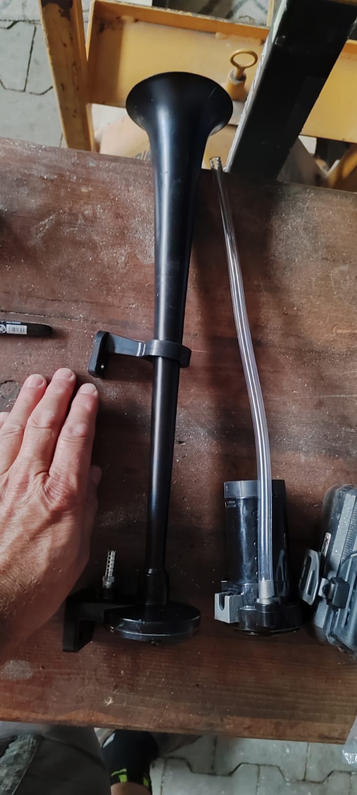 So ein Horn bekommt man an zwei Stellen unter. Der kleine Kompressor geht auch zum Verstecken.