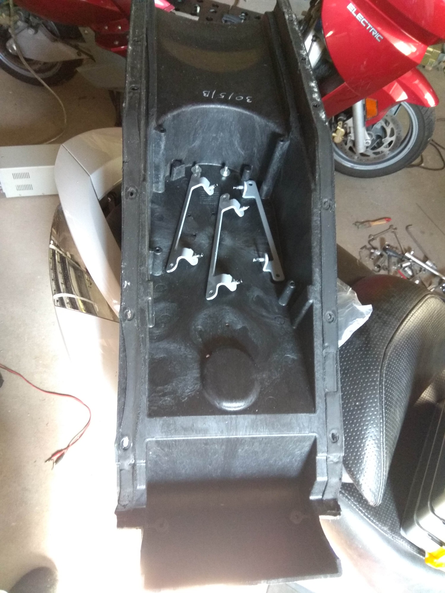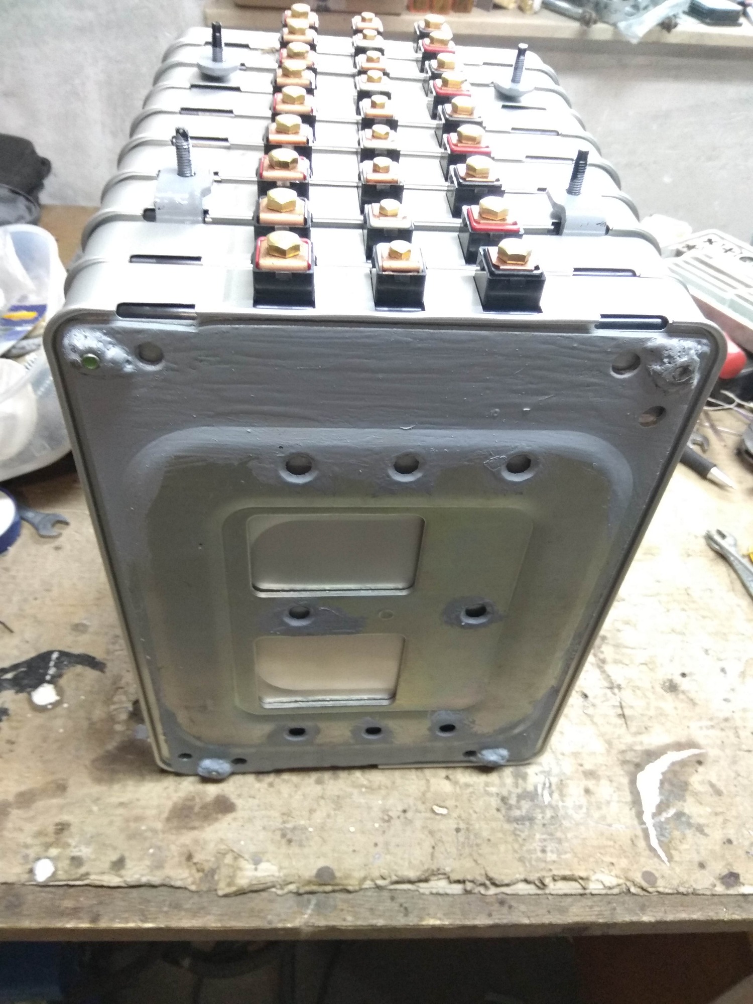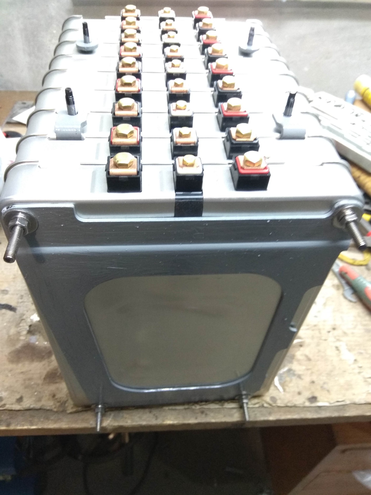 In der ausgeräumten Akkubox-Abdeckung sind lose liegend 3 von den in Japan bestellten Haltern zu sehen, ich habe sie nochmal grau lackiert, die werden zwischen die einzelnen Module oben in den Stack eingelegt und an denen kann ich dann Griffe anbringen um die Akkublöcke später aus der Box oder in die Box zu heben.