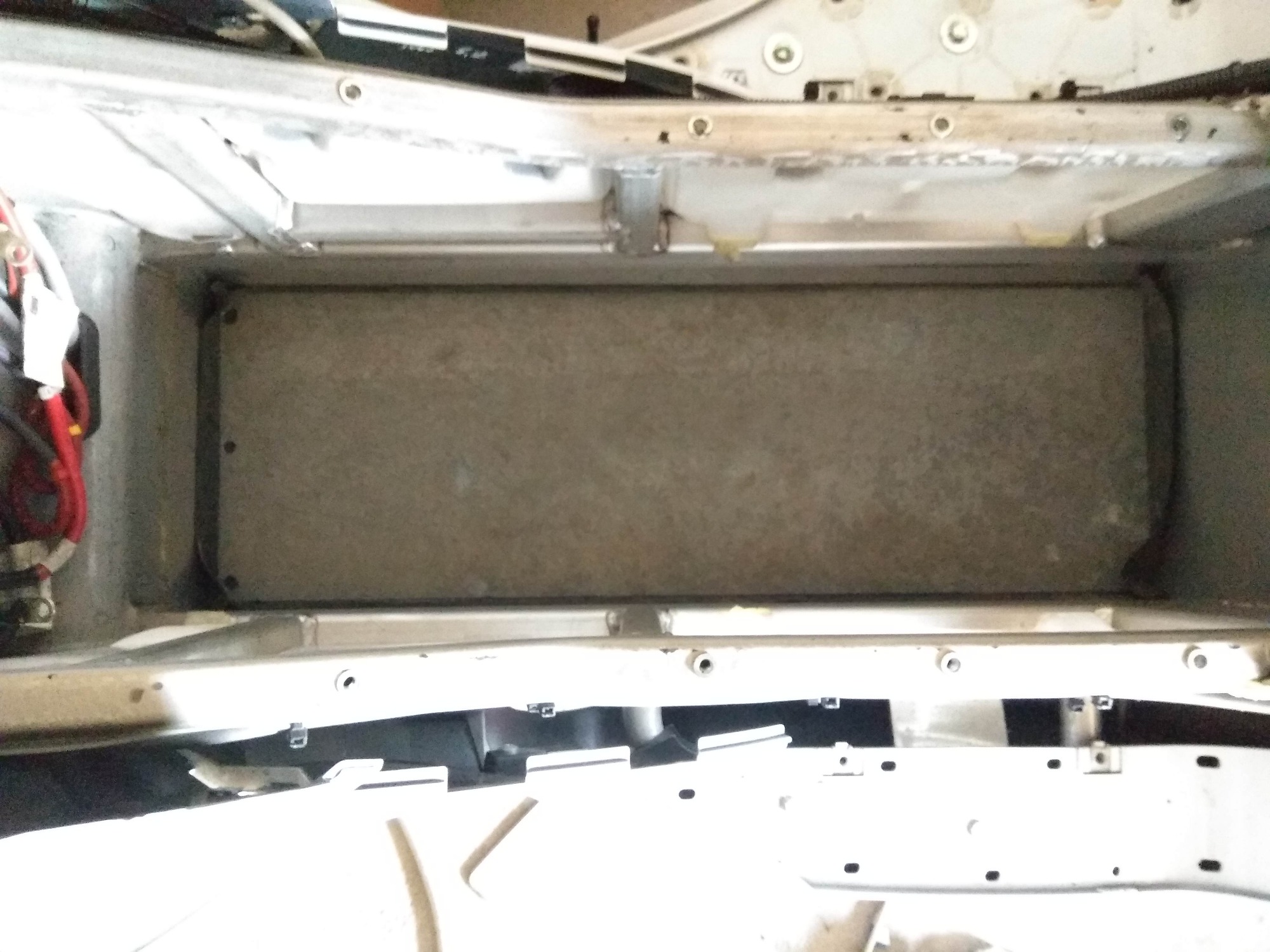 In das Akkufach wurde zuerst eine EPDM-Gummifolie auf den Boden eingelegt und darüber ein verzinktes 1mm-Stahlblech vom Schrottplatz passend zugeschnitten und eingelegt. Auf den Erhalt der Bohrungen für den Ablauf eventuell eindringenden Wassers ist zu achten. Darüber wird wieder Gummifolie kommen bevor die Modulstacks dann darauf gestellt werden.