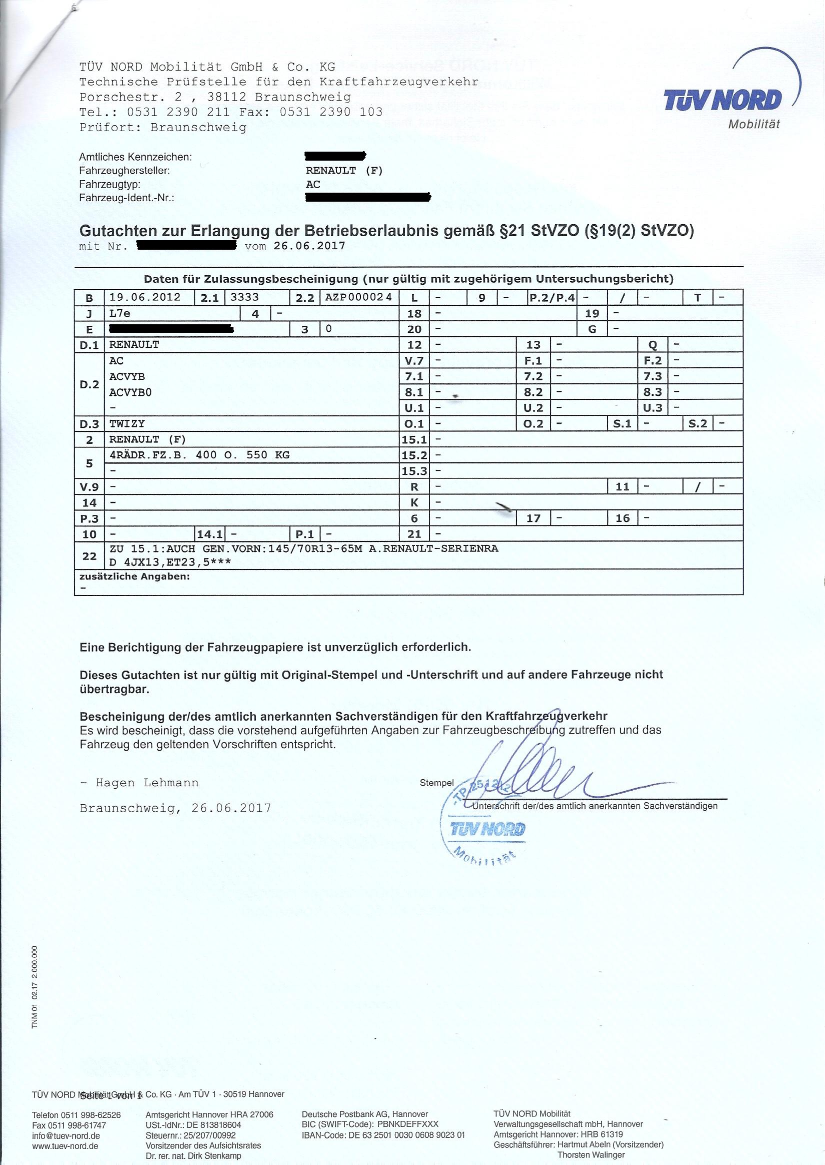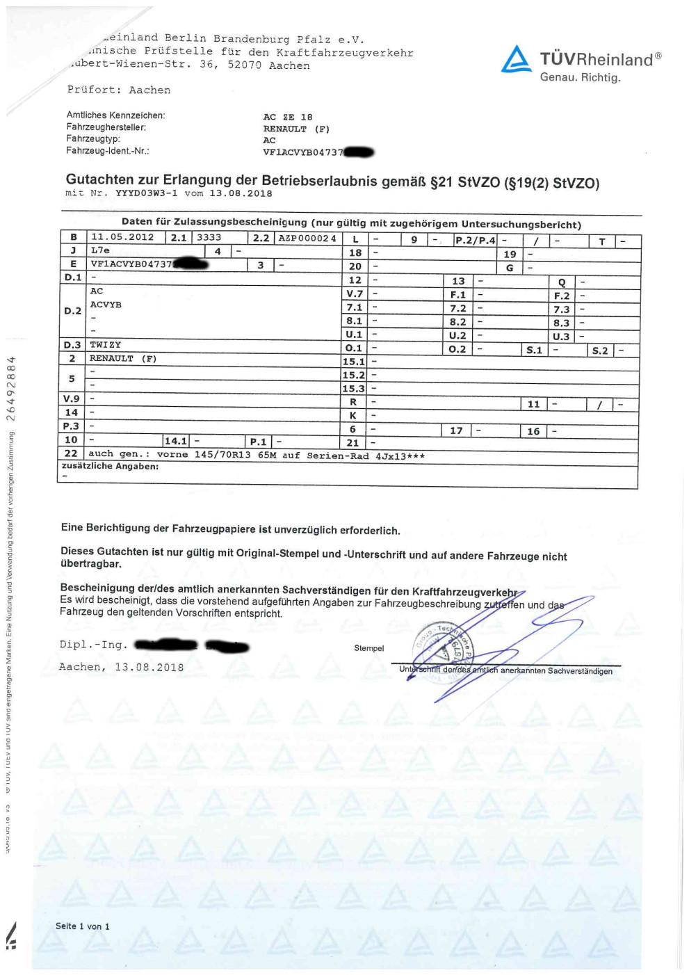 Leider will unser TÜV in Mönchengladbach das nicht eintragen ohne Gutachten, von Renault über die ORIGINAL Alu Felgen usw.