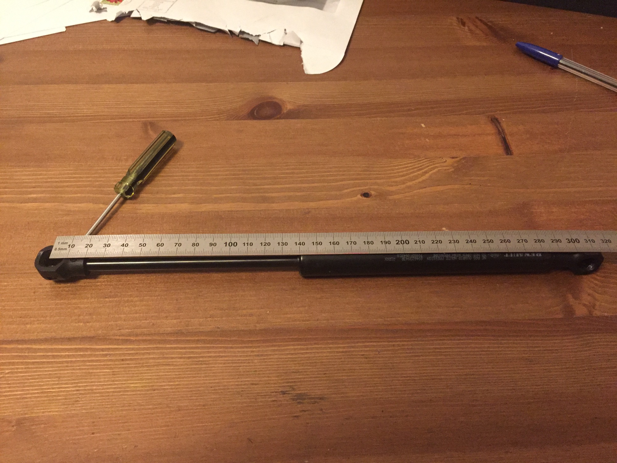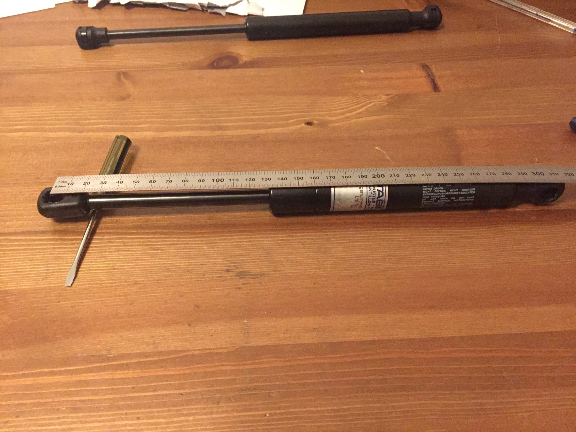 Die Originalfedern messen 309-310mm von Auge zu Auge und der ausfahrbare Teil sollte nicht unter 115mm lang sein, weil ihr dann eure Tür nicht mehr sauber zubekommt.