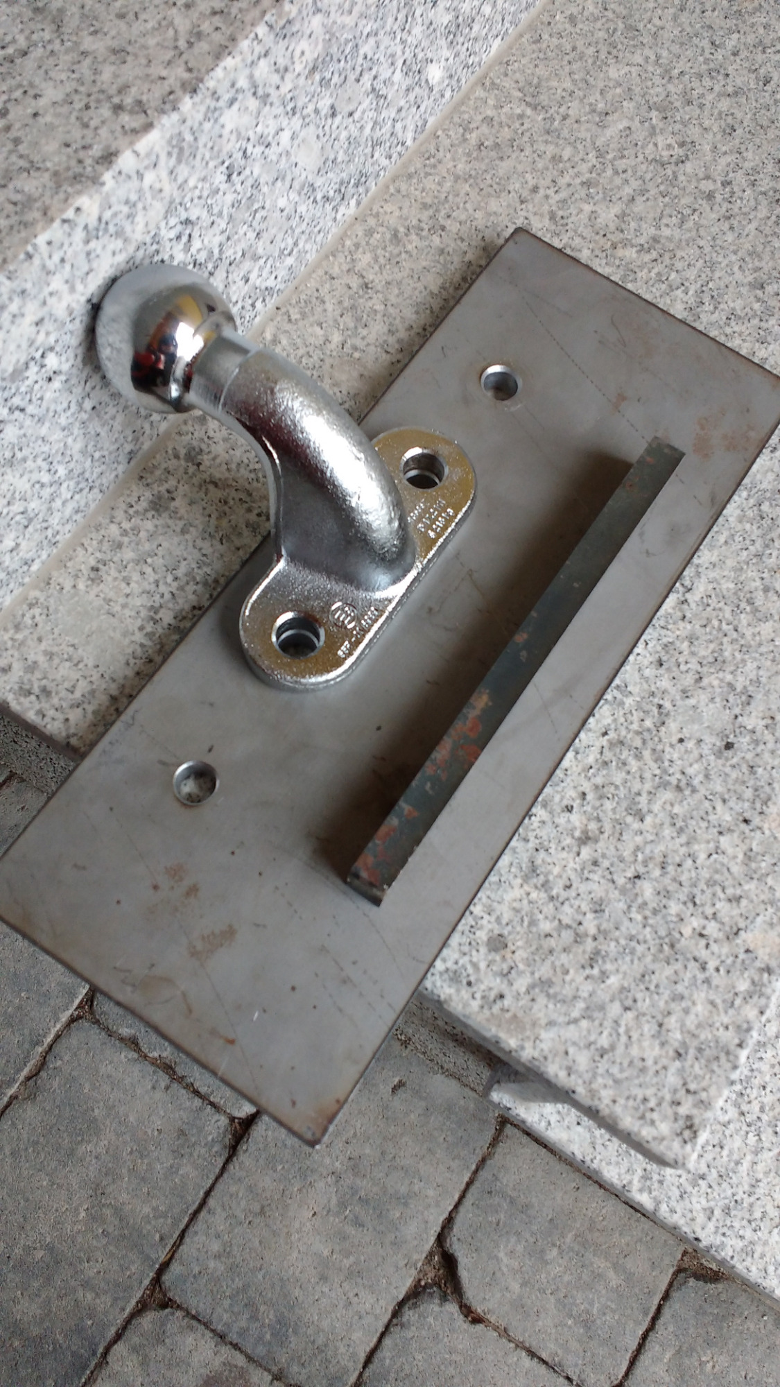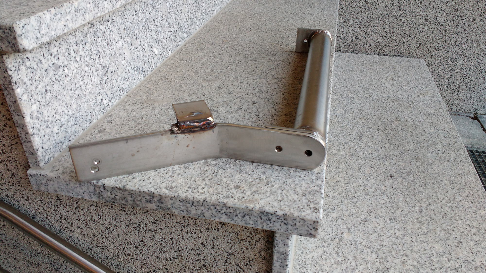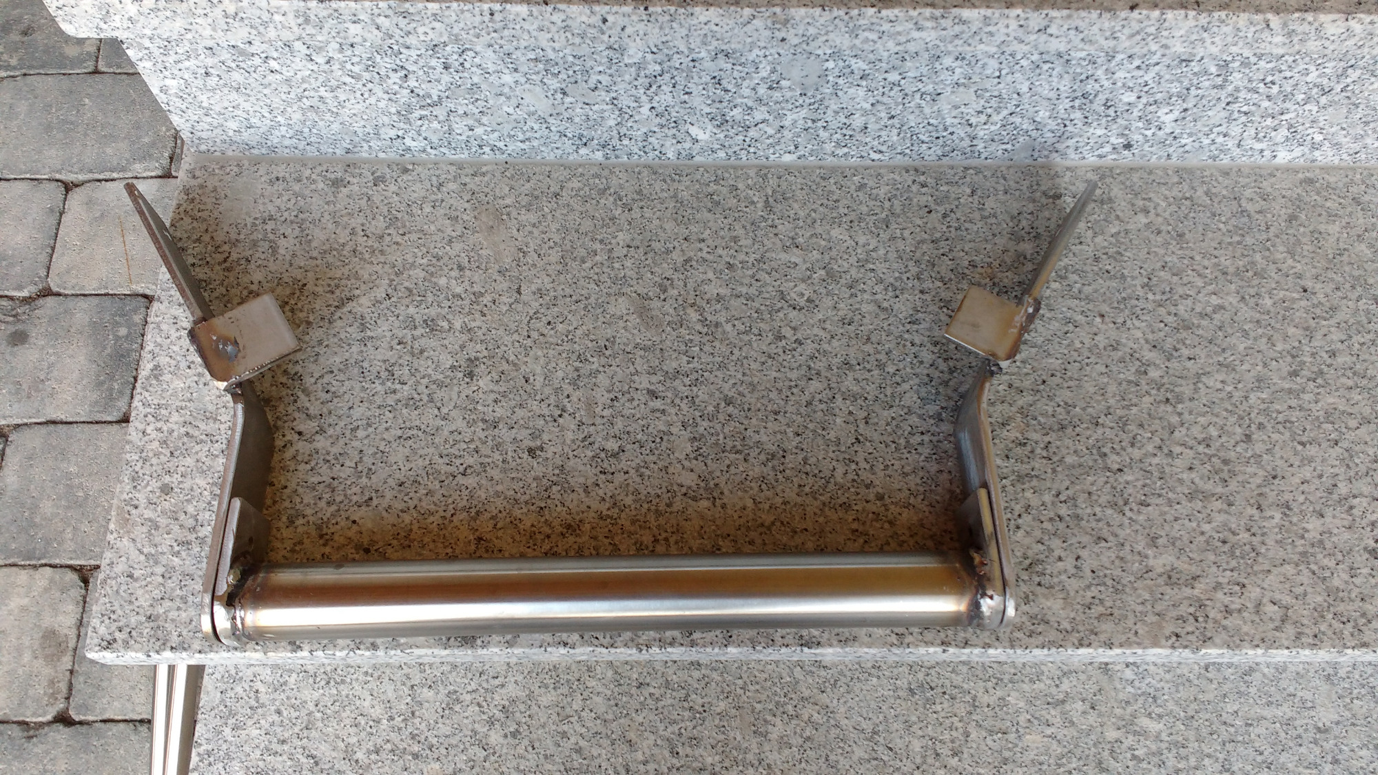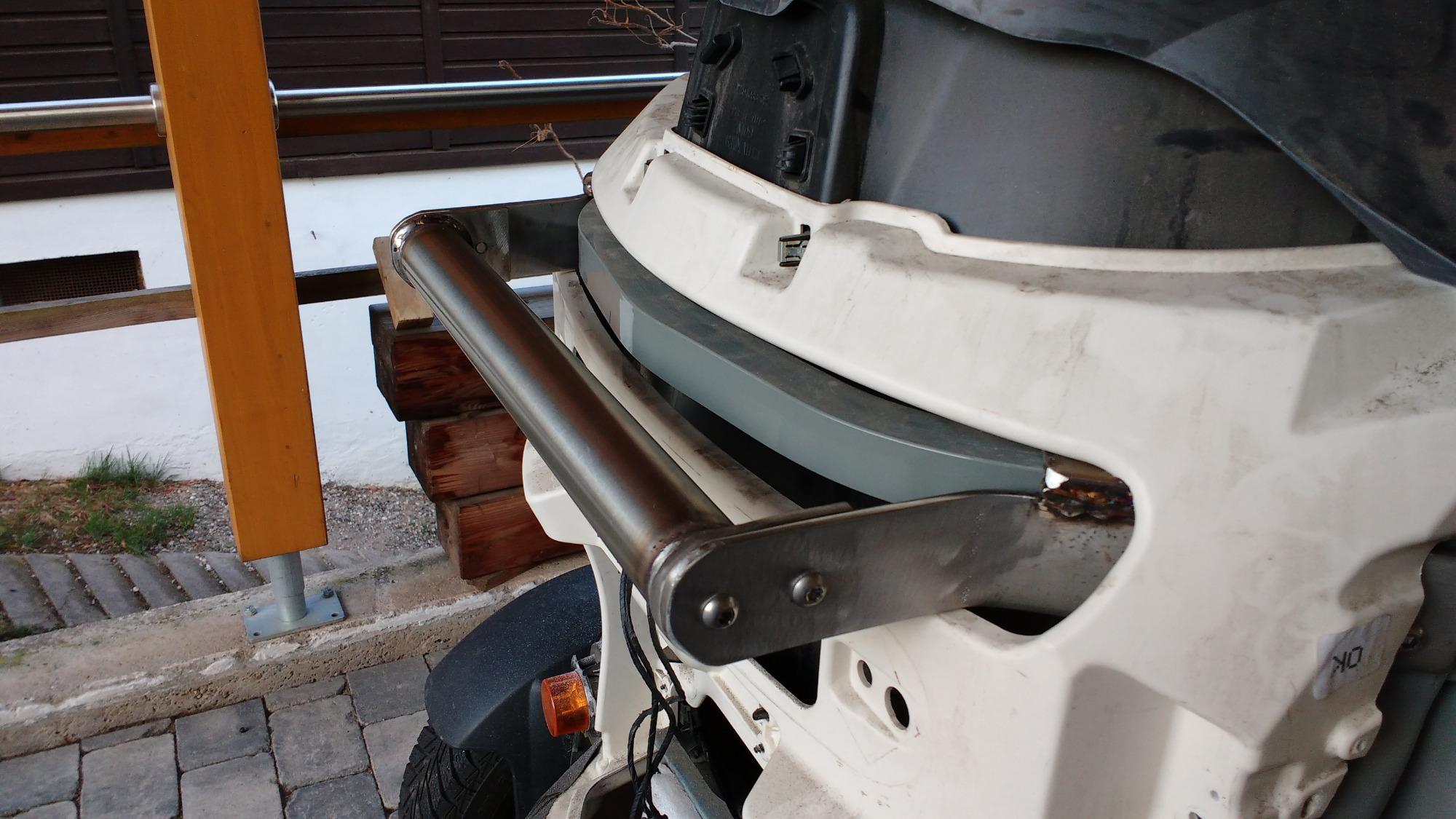 War gar nicht so leicht einen geeigneten Befestigungspunkt für die Streben zu finden, zu guter letzt hab ich mich für den Knotenblechbereich entschieden. Dort ist das von unten kommende Rohr gepresst und verschweißt, daher die 3-fache Materialstärke. Die VA Streben stützen sich auch auf dem Querrahmen ab.