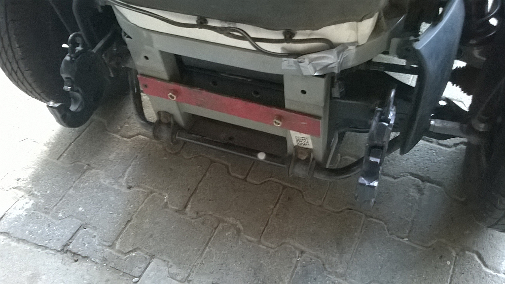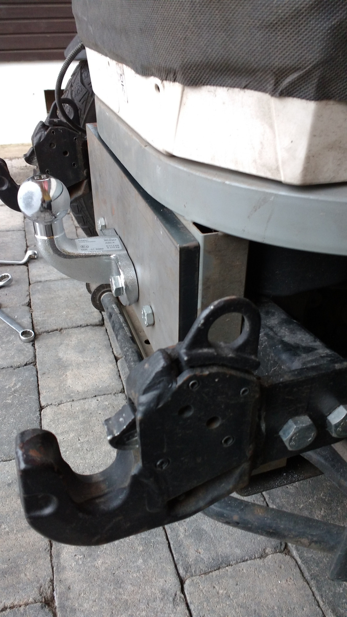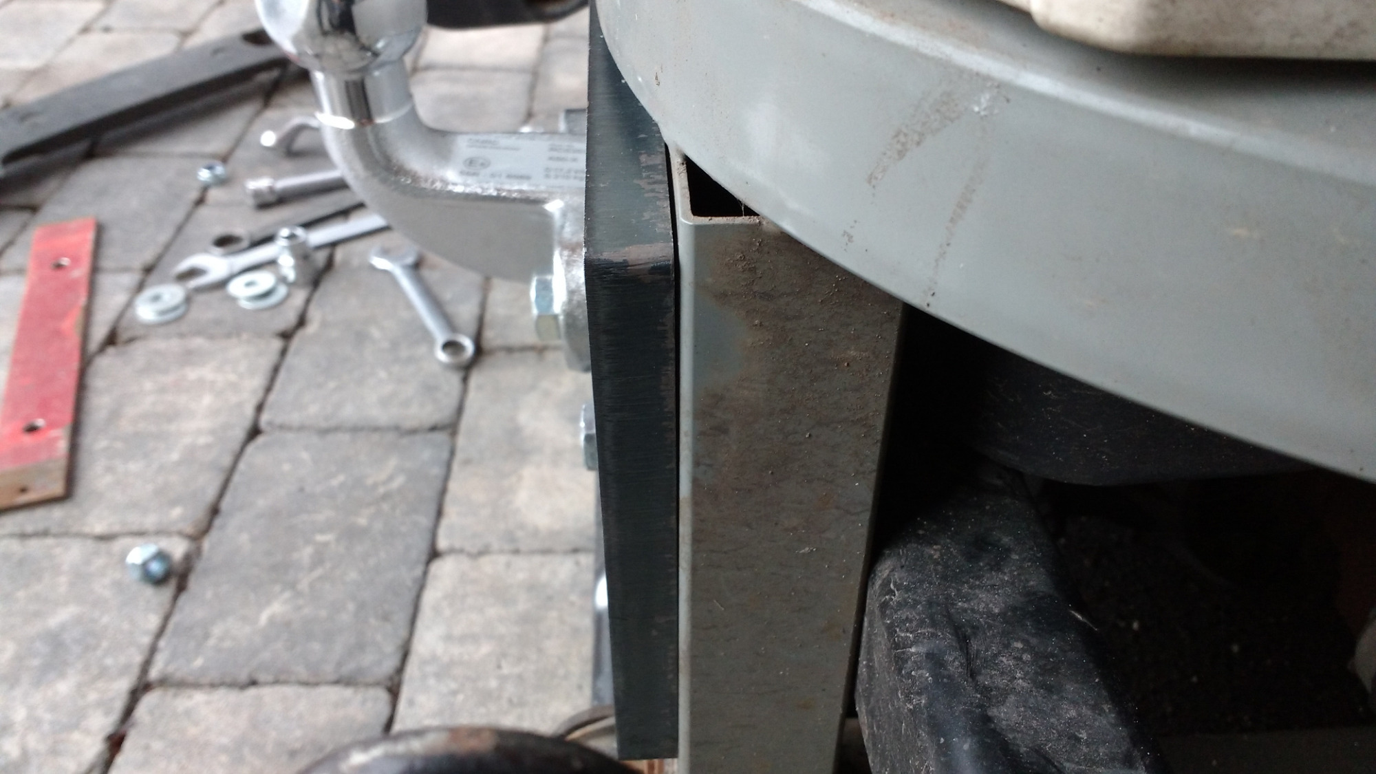 Die untere Befestigung ist auf dem Pic noch im Anpassungsstadium, das rote Flachstahlstück wird mitte der Woche durch die knapp A4 große 12mm Stahlplatte ersetzt, in der auch die KugelkopfAHK befestigt wird. Die Verbindungsschrauben auf den Querträger (ex-VWBus AHK 60x30x6mm Rechteckprofil )