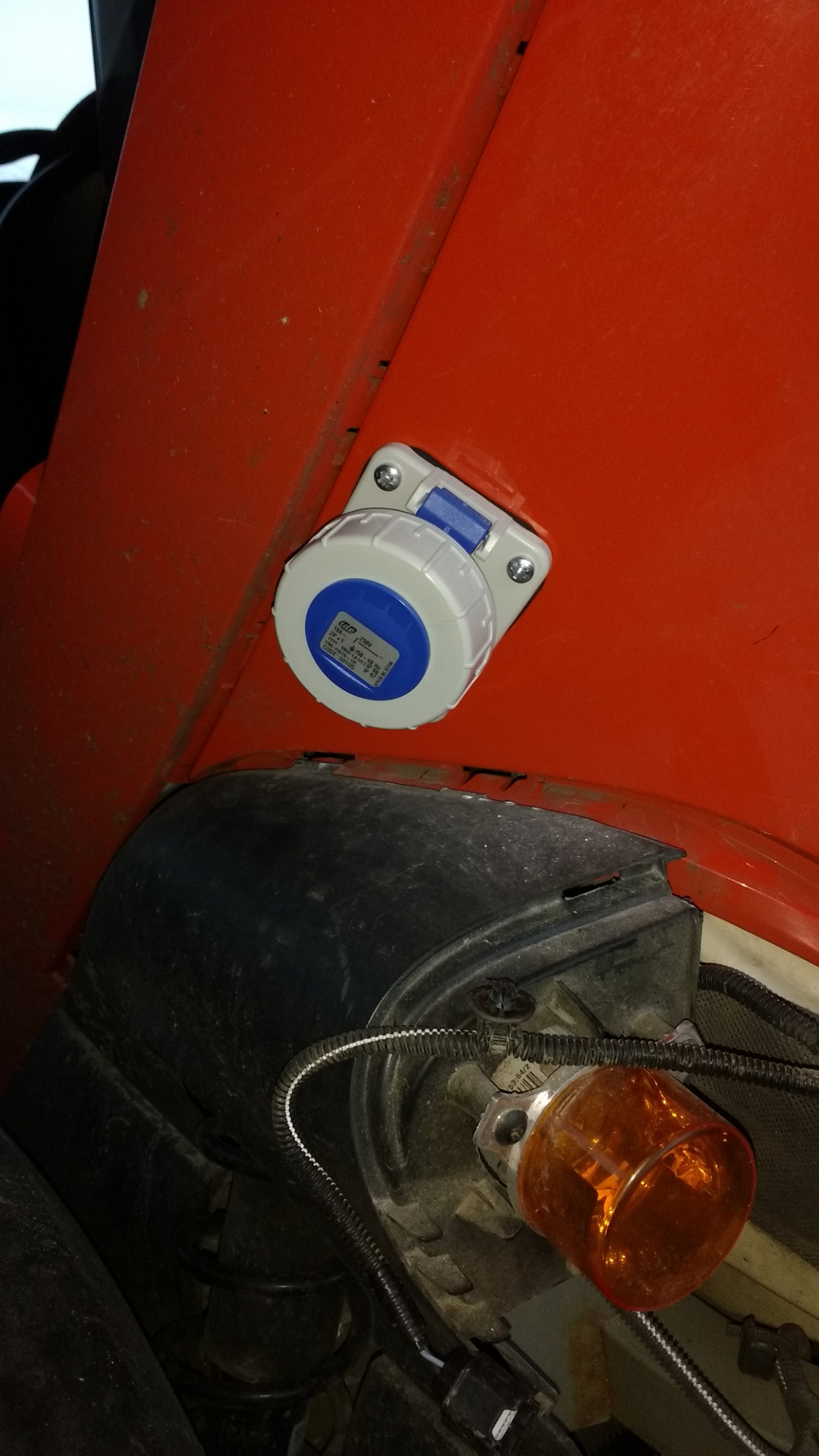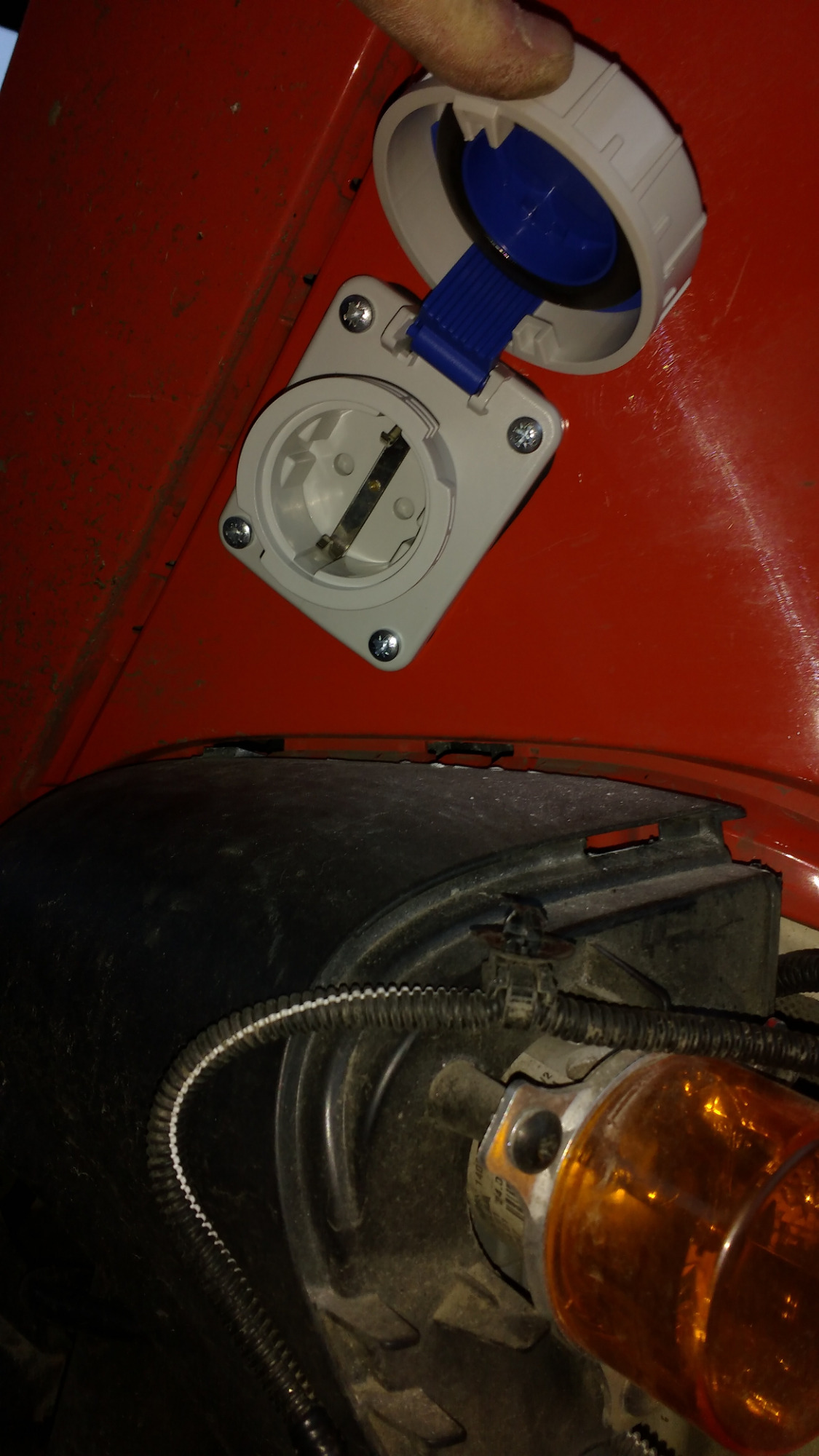 Die Typ2 Dose wird bis Sinsheim auch fertig, heute kam die Zusatzschuko für L2 in IP68 an, die sitzt hinten links in der Verkleidung. Die Anschlüsse innen sind mit dauerelastischem Material abgedichtet, die Leitung läuft im Schweller nach vorne in den Fußraum vor den Lader, da sitzt auch das Umschaltschütz für die originale Schukoleitung ( wenn über Typ2 geladen wird trenn ich die Spiralleitung automatisch ). Die "nur" IP44 für L3 kommt unter das rechte Handschuhfach.
