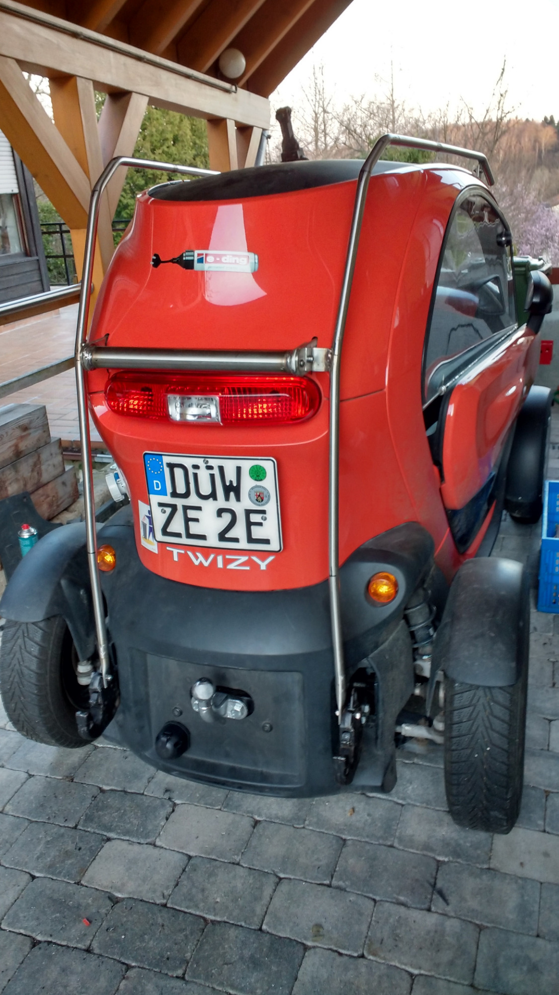 Sodele, trotz widrigster Umstände ( Querregen, Nachtfrost, Gartenarbeit... ) ist der Dachrelingsprototyp dran. Leider fehlen mir immer noch diverse Teile ( Sonnenblende, Halterung, Klemmungen für die Querstreben auf dem Dach... ), aber zumindest hält das Ding so wie geplant. Die nächste Version lass ich wahrscheinlich aber hinten quer zusammenlaufen und folge mit den Dachrohren der Kontur des Dachrandes, sieht imho besser aus.