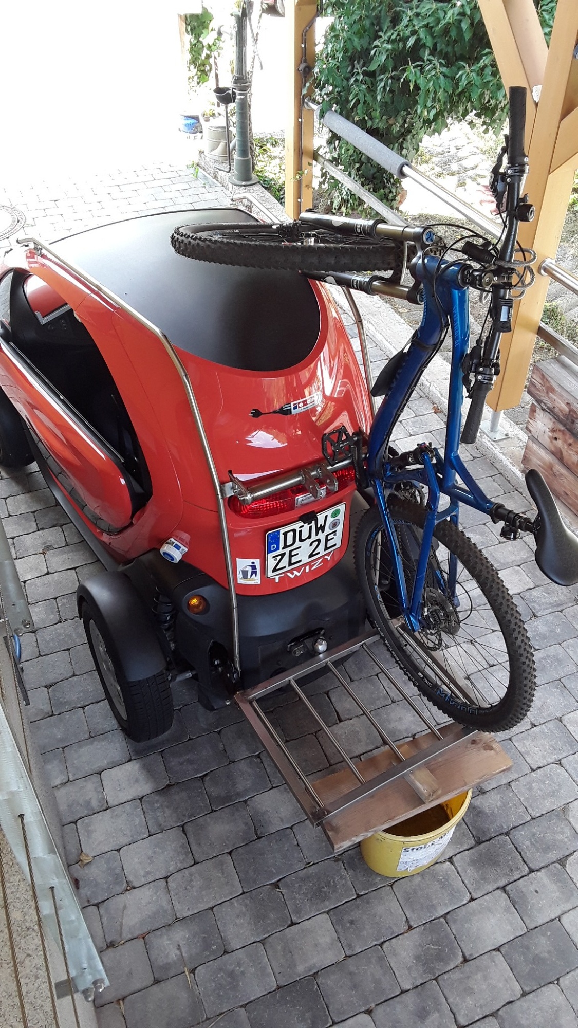 Den Radträger (Rahmenklemme) gibts von Thule als Ersatzteil, unten und oben am Relingsquerrohr reicht dann ein Schnellspanner. Die Vorderachse am Canyon ist leider fest. Durch den Radgrößenunterschied passt das MTB meiner Holden auch noch daneben, die hat noch ein 26er.