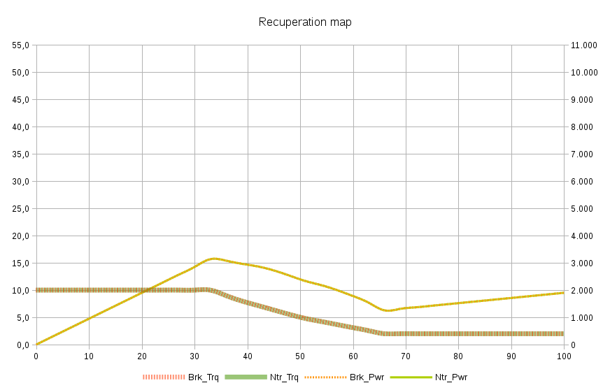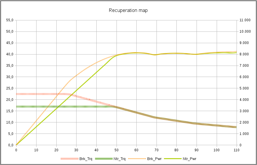 Das hier ist die Standard-Rekuperationskennlinie eines T80 (linke Achse = Drehmoment in Nm, rechte = Leistung in W, X-Achse = Geschwindigkeit):