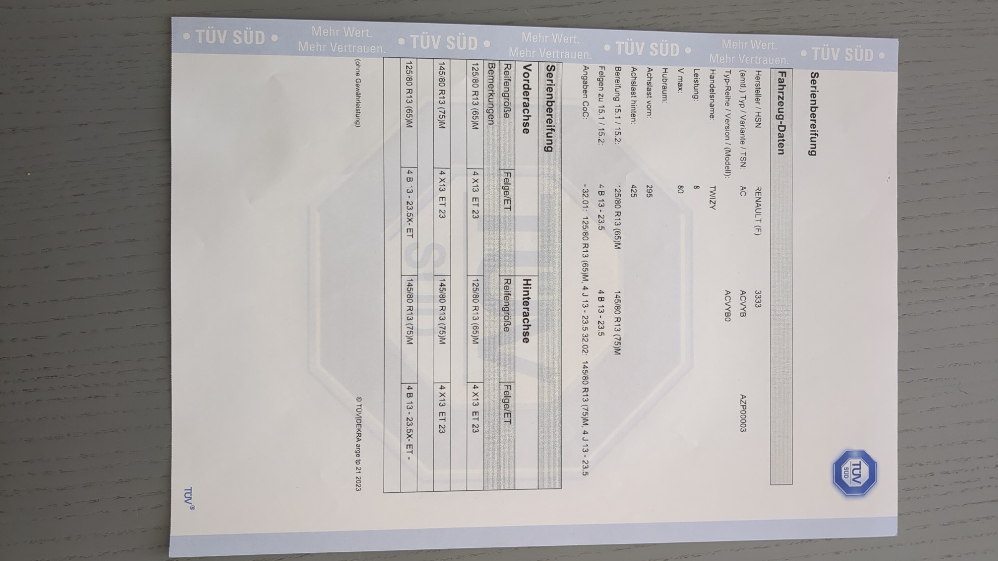 Ich hab heute mal die Gunst der Stunde genutzt und unseren TÜVer bezüglich freigegeber Reifenkombinationen am Twizy ausgefragt. Erstaunlicherweise haut sein System vom TÜV SÜD folgende Daten raus. 145/80 R13 sind für vorne freigegeben. Jetzt bin ich ein wenig confused, weil soweit Ich mich erinnere, vorne gar keine 145/80 R13 unter die Radläufe passen. Ich hänge mal den Auszug aus dem TÜV System von heute an. Er meinte wenn die passen braucht da nix eingetragen werden so lange es die Größe gemäß Dokument ist.